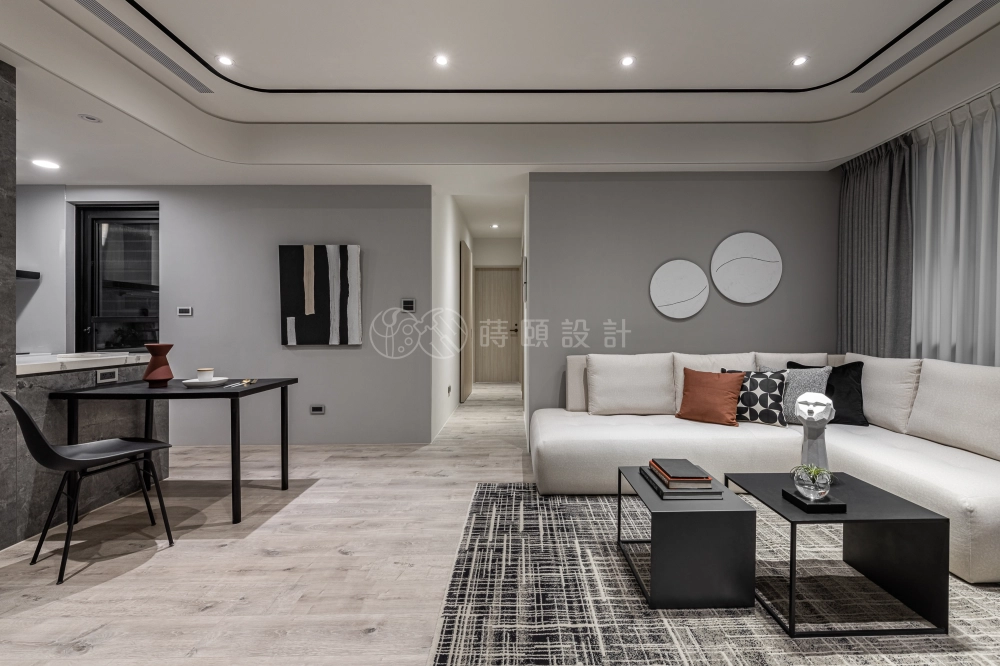 23坪灰階現代簡約宅,以光影、木質與極簡線條打造沉穩又溫柔的住宅氛圍。隱藏式收納、流線天花與雙面櫃體整合機能與美感。