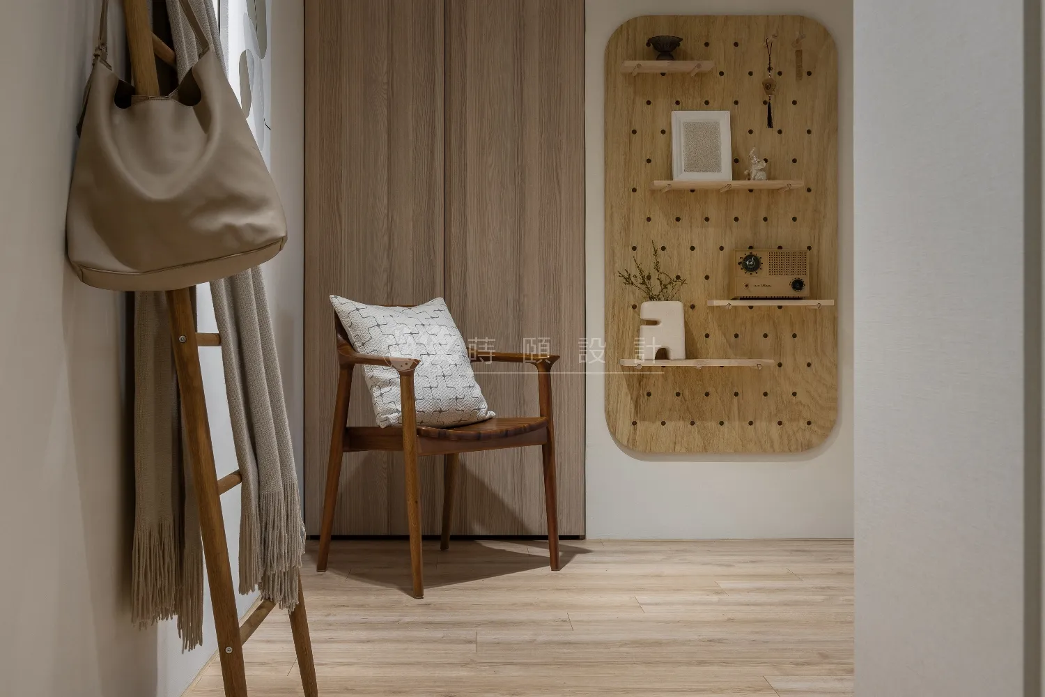 蒔頤因應需求設計,重新規劃公共機能與動線,收納物品規劃統合下,利用設計技巧配置空間,降低大柱造成空間破碎影響,同時增加收納坪效與引進光線,增加居所明亮度外,平整牆面延續視覺動線,減壓風格的材質放大空間延展,創造收納性與明亮感兼顧的溫潤居所。
